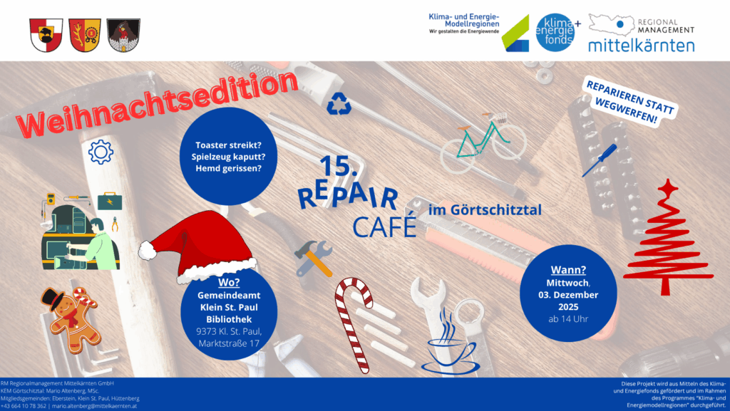 Das Repair Café geht in die nächste Runde. Es freut die KEM sehr, dass das Repair Café so gut angenommen wird, daher findet am 03. Dezember 2025 ab 14 Uhr das nächste Repair Café in der Bibliothek der Marktgemeinde Klein St. Paul statt.